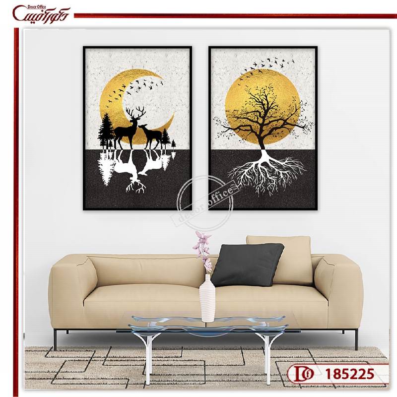تابلو ست فانتزی دوتایی انتخاب بسیار مناسبی برای فضاهای ساده و مینیمال می باشد. طرح های تابلو های ست با هم هماهنگ است و گاهی نیز امتداد یک طرح در دیگر تابلو وجود دارد. در این صورت نمی توان تابلو ها را در ارتفاع متنوع نصب کرد؛ اما در خصوص تابلو دکوراتیو پیش رو می توانید آن را در ارتفاع دلخواه نصب کنید. در این طرح از یک طرح فانتزی جذاب و امروزی استفاده شده است که با فضای مدرن هماهنگ است. عناصری مانند گوزن، ماه و درخت در این طرح به کار رفته اند. این عناصر در بیشتر تابلوهای فانتزی کاربرد دارند.