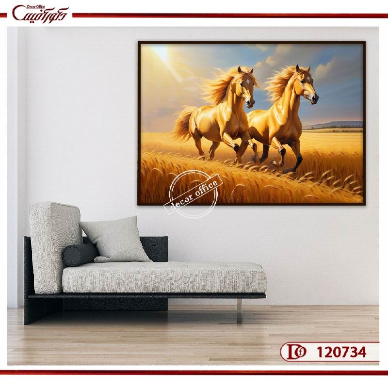 تابلو بوم اسب طلایی در گندمزار – شکوه حرکت و انرژی مثبت در دکوراسیون