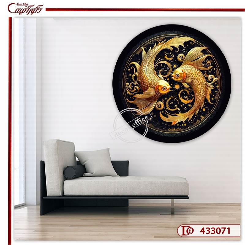 تابلو دو ماهی طلایی فنگشویی یک طرح بسیار زیبا است که روی بوم دایره چاپ شده است. در فنگ شویی با توجه به نوع طرح باید از بوم با اشکال هندسی متنوع استفاده شود. در این طرح نیز از بوم دایره شکل استفاده شده است که برای چنین نمادی کاربرد دارد. نماد ماهی در آثار فنگشویی به شکل های متنوعی به کار می رود که از پرتکرارترین آن استفاده از دو ماهی است. ممکن است نوع طراحی و رنگ این نماد در آثار مختلف متفاوت باشد. در این طرح از رنگ تیره و مشکی برای پس زمینه و رنگ طلایی برای دو ماهی استفاده شده است. رنگ طلایی روی پس زمینه مشکی نمود بیشتری دارد.