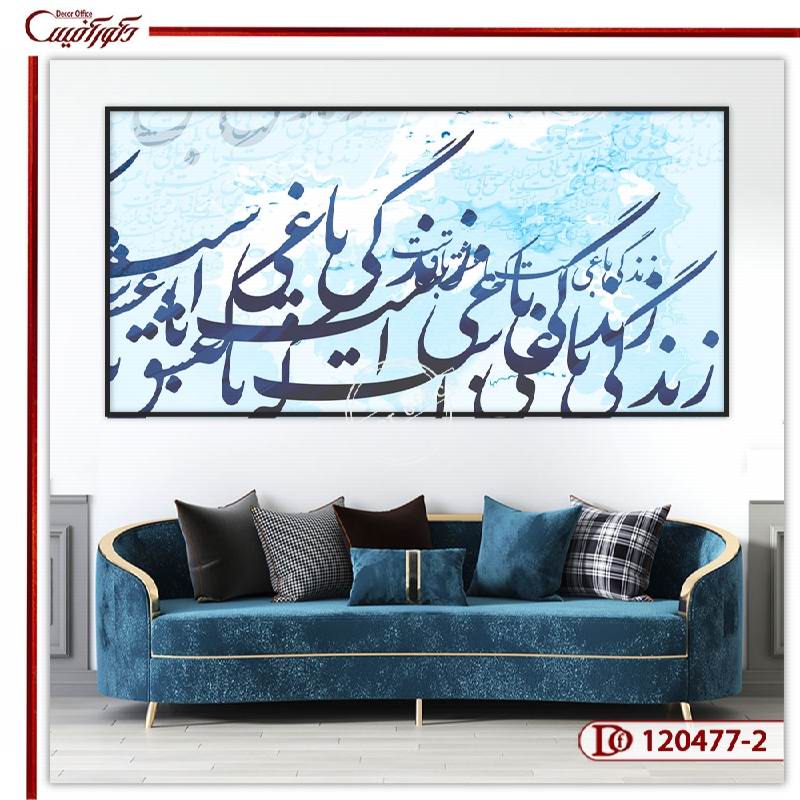 تابلو دکوراتیو خط نستعلیق 120477-2 که روی بوم مستطیل چاپ شده است، دارای یک طرح زیبا است. می توانید این تابلو را با توجه به نوع طراحی فضا، در بخش دلخواه نصب کنید. استفاده از خط در آثار نقاشی معاصر اولین بار کاربرد داشت. البته این ترکیب در کنار نقاشی بود. در این طرح نیز اگر پس زمینه را نقاشی محسوب کنیم، یک کار تلفیقی از خط و نقاشی ایجاد شده است. رنگ فیروزه ای پس زمینه نیز با خوشنویسی روی آن هماهنگ است. می توانید این رنگ را با رنگ مبلمان هماهنگ انتخاب کنید. امروزه طرح های متنوعی برای تزیین دیوار فضاهای داخلی ارائه می شود. مثلا در یک فضای مسکونی می توانید از طرح پیش رو استفاده کنید. این طرح برای کاربری خاصی طراحی نشده است.