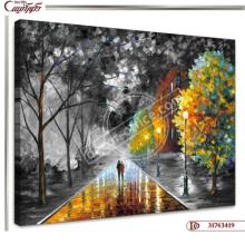 تابلو دکوراتیو طبیعت مقابل سرشار از احساسات و موسیقی روح انسان است. در این تابلو بی نظیر زوجی را می توان دید که در حال قدم زدن هستند، درختان سبز و زرد رنگ زیبایی متفاوتی به اثر بخشیده اند. اگر کمی با دقت با تابلو دکوراتیو طبیعت نگاه کنید می بیند که پیوند رنگ های سرد و گرم خالق پدیده ای با ظرافت شده اند و استفاده از رنگ بنفش درخشش خاصی به تابلو داده است. نصب این تابلو فوق العاده در دکوراسیون های رنگ ملایم و خنثی جلوه ی آن را چند برابر خواهد کرد.