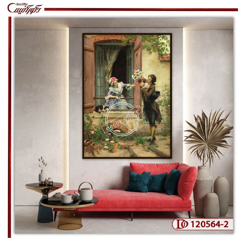هنر کلاسیک همواره توانسته است لحظات ناب زندگی را با ظرافت و جزئیات شگفتانگیز به تصویر بکشد، و این تابلو دکوراتیو نمونهای برجسته از چنین هنری است. این اثر، صحنهای لطیف از یک ملاقات عاشقانه را نشان میدهد: مردی با لباسی شیک و رسمی، دستهگلی از شکوفههای تازه را با احترام و علاقه به بانویی که پشت درب چوبی ایستاده است، تقدیم میکند. زن با لبخندی ملایم و نگاهی سرشار از محبت، دستش را برای گرفتن گلها دراز کرده — گویی این لحظه، تجسم خالصی از محبت و احساس است.