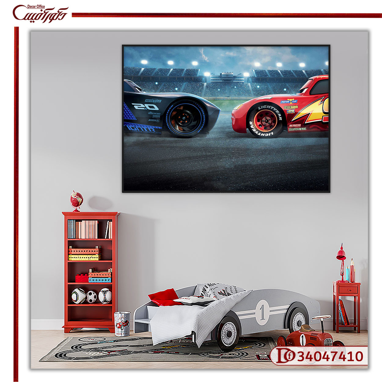 تابلو دیواری پسرانه ماشین مسابقه یکی از طرح های جذاب تابلو کودک است که طرفداران زیادی دارد. از این رو می توان در اتاق خواب پسران از این طرح برای تزیین دیوار استفاده کرد. امروزه تصاویر متنوعی به صورت واقعی، نقاشی شده یا ادیت شده برای چاپ روی تابلو انتخاب می شوند. در این طرح نیز دو ماشین مسابقه با رنگ های قرمز و آبی در مقابل یکدیگر قرار گرفته اند. پسران از سنین پایین تا نوجوانی علاقه شدیدی به طرح ماشین های روز دارند. از این رو یکی از سوژه های مناسب برای چاپ روی بوم نقاشی، تصاویر اتومبیل است. ماشین هایی که در مسابقات مورد استفاده قرار می گیرند نیز جذابیت زیادی برای کودکان دارند و به همین دلیل طراحان برای ارائه تابلو از آن استفاده می کنند.
