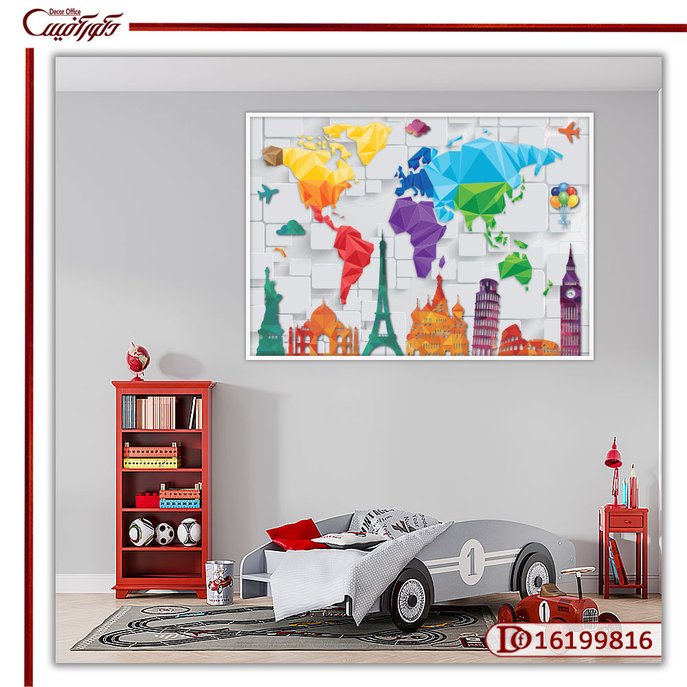 تابلو دیواری کودک نقشه جهان یکی از طرح هایی است که از جنبه آموزشی نیز قابل بررسی است. در این تابلو علاوه بر استفاده از نقشه جهان، از تصاویر بناهایی مشهوری مانند برج ایفل نیز استفاده شده است. این نوع طرح ها می توانند از سنین پایین، کودک را با موضوعات آموزشی آشنا کنند. هر کدام از قاره ها با یک رنگ نمایش داده شده اند. استفاده از رنگ در این تابلو دیواری کودکان موجب جذابیت آن شده است. در نتیجه کودک علاقه دارد که این طرح را بررسی کند و به آن توجه کند. تابلو ها اغلب روی بوم مستطیل ارائه می شوند و امکان خرید آن ها با اندازه های متنوع نیز وجود دارد. در این صورت ممکن است قیمت آن تحت تاثیر ابعاد بوم تغییر کند.
