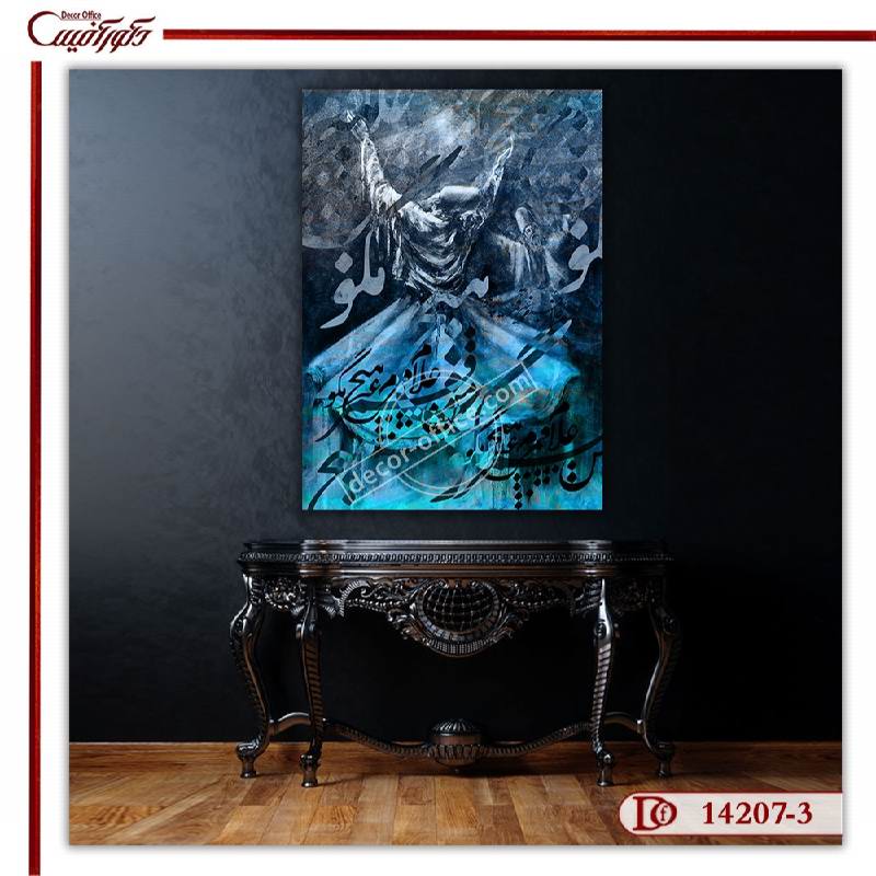 🔸 معرفی اثر:تابلو رقص سماع کد 14207-3، ترکیبی چشمنواز از حرکت، عرفان و معنا را به تصویر میکشد. این اثر با رنگهای عمیق آبی و خاکستری، درویشی را نشان میدهد که در میانهی سماعِ بیانتها، به فنا و بیخودی رسیده است.