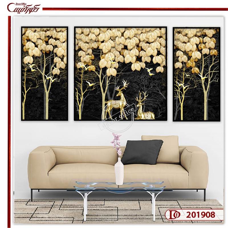 تابلو ست جنگل و گوزن طلایی یک تابلو سه است که به صورت فانتزی طراحی شده است. در این اثر، تابلو مرکزی با ابعاد بزرگ تری طراحی شده است و تابلو های کناری، کوچکتر هستند. این موضوع موجب شده است که تمرکز مخاطب بیشتر روی طرح مرکزی باشد که در آن از عناصری مانند درخت و گوزن استفاده شده است. دو گوزن طلایی رنگ در زیر درختان در بوم مرکزی نشان داده شده اند. همانطور که مشاهده می کنید طرح روی بوم ها با هم ارتباط مفهومی دارد و همین مورد موجب جذابیت طرح شده است.