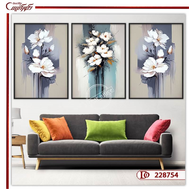 تابلو سه تکه گل فانتزی یکی از طرح های کاربردی است که می توان از آن به منظور تزیین دیوار فضای مدرن استفاده کرد. امروزه بیشتر ساختمان ها به صورت مدرن طراحی می شوند. در نتیجه از عناصر تزیینی متناسب با این سبک مانند تابلو دیواری فانتزی باید برای تزیین این بخش ها استفاده کرد. در هنگام انتخاب طرح برای تابلو، باید به نوع طراحی توجه شود و متناسب با آن طرح مورد نظر انتخاب شود. در طرح پیش رو تصویر گل های سفید در سه بوم نقاشی دیده می شود. این گل ها به شکل فانتزی طراحی شده اند و طرح های کناری به صورت قرینه کار شده اند. تصویر چاپ شده روی بوم مرکزی، با دو بوم کناری متفاوت است. به دلیل عدم امتداد و پیوستگی بین 3 تابلو دیواری، می توان هر کدام را در ارتفاع مختلف برای ایجاد تنوع نصب کرد.
