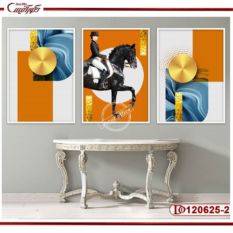 این تابلو مدرن از سه قطعه جداگانه تشکیل شده که در کنار هم یک ترکیب بصری منسجم را ایجاد میکنند. در مرکز، تصویری از یک اسب سیاه قدرتمند به همراه سوارکاری آراسته دیده میشود که نماد شکوه، اصالت و حرکت است. دو بخش جانبی با طراحی انتزاعی، از رنگهای طلایی، آبی و نارنجی برای تکمیل این ترکیب استفاده کردهاند.
