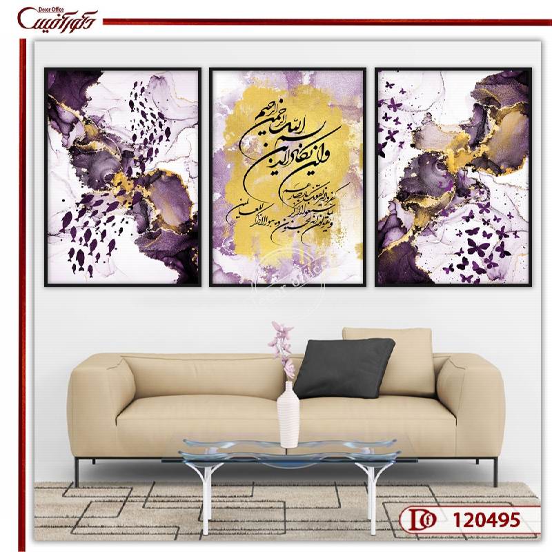 متن آیه با خطی زیبا و ترکیبی از رنگ‌های بنفش، طلایی و سفید بر روی بوم چاپ شده و در کنار طراحی مدرن و سه‌تکه، جلوه‌ای متفاوت و خاص ایجاد کرده است. این تابلو دیواری مذهبی انتخابی مناسب برای کسانی‌ست که می‌خواهند فضای زندگی یا کارشان را با مفاهیم قرآنی و جلوه‌ای هنری تزیین کنند.