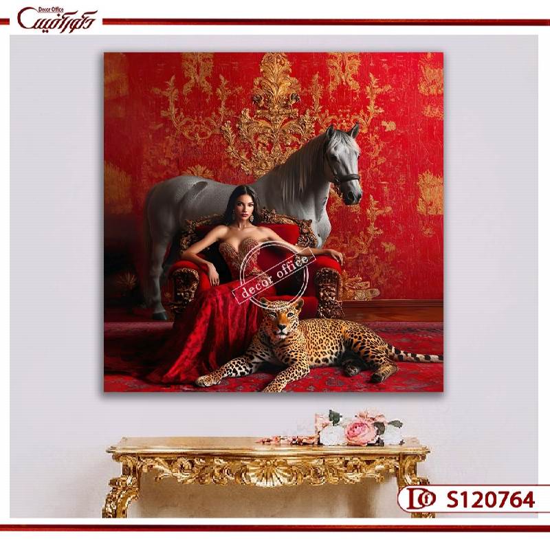 تابلوی ملکه قدرت یکی از آثار خاص در سبک نقاشی دیجیتال کلاسیک است که تلفیقی از هنر سنتی و مدرن را در خود جای داده. این تابلو روایتگر شکوه و اصالت زنانه است؛ بانویی با لباس سرخ فاخر در کنار اسب سفید و پلنگ، ترکیبی نمادین که مفاهیم قدرت، نجابت و جسارت را در یک قاب لوکس به نمایش می‌گذارد. همین ویژگی‌ها باعث شده این اثر به یکی از محبوب‌ترین نمونه‌های دیجیتال آرت در حوزه دکوراسیون لوکس تبدیل شود.