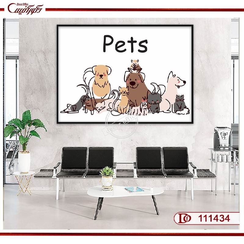در تصویر پیش رو از واژه Pets به معنی حیوانات خانگی روی طرح استفاده شده است. با توجه به اینکه امروزه نگهداری از پت بسیار رایج شده است، طرح های متنوع از سگ، گربه و سایر حیوانات خانگی به صورت تابلو دکوراتیو ارائه می شود. برای خرید تابلو کلینیک حیوانات و پت شاپ می توانید به صورت آنلاین اقدام کنید. در این صورت تنها کافی است که طرح مورد نظر را انتخاب و ابعاد بوم نقاشی را مشخص کنید. با توجه به میزان بودجه ای که برای خرید تابلو در نظر گرفته اید می توانید طرح را در اندازه و ابعاد مختلف سفارش دهید.