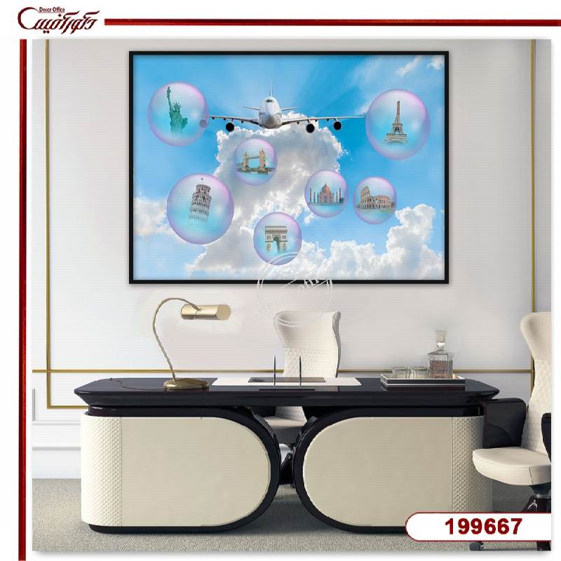 این تابلو جذاب، گویی ما را به دنیایی دیگر میبرد؛ دنیایی که در آن مرزها محو شدهاند و بناهای تاریخی و نمادهای فرهنگی در حبابهایی شفاف و درخشان معلقاند. در مرکز تصویر، یک هواپیما با شکوه از میان ابرهای سفید و آسمان آبی عبور میکند، در حالی که نمادهای شاخص جهان درون حبابهایی شناور، همچون رؤیاهایی که در انتظار کشف شدن هستند، دور آن میچرخند.
