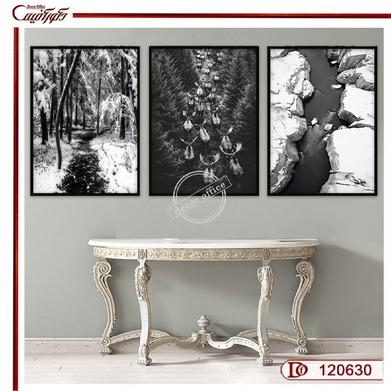 تابلوهای سیاهوسفید یکی از عمیقترین و تاثیرگذارترین انتخابها برای دکوراسیون داخلی هستند. آنها بدون نیاز به رنگ، با بازی نور و سایه، احساسات عمیقی را منتقل میکنند و بیننده را به تفکر و تأمل دعوت میکنند. این مجموعه سهتایی، طبیعت را در سه حالت متفاوت به تصویر میکشد: جنگل زمستانی، گوزنهای در حال حرکت در میان درختان، و رودخانهای که میان صخرهها شکاف انداخته است. هر تابلو انگار یک فصل از یک داستان طولانی است — داستانی از حیات، حرکت و تأثیر زمان بر طبیعت.