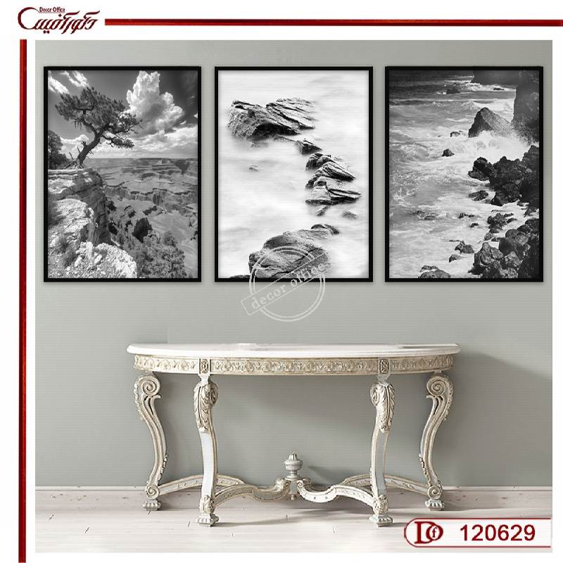 تابلوهای سیاهوسفید همیشه یک انتخاب خاص و شیک برای دکوراسیون داخلی بودهاند. این ترکیب رنگی، احساسات عمیق، مینیمالیسم و زیبایی بیانتها را به تصویر میکشد. در این مجموعه سهتایی، طبیعت در سه حالت متفاوت به نمایش درآمده است: درخت تنها در لبه پرتگاه، مسیر سنگی در دل آب، و موجهای خروشان که به صخرهها برخورد میکنند.