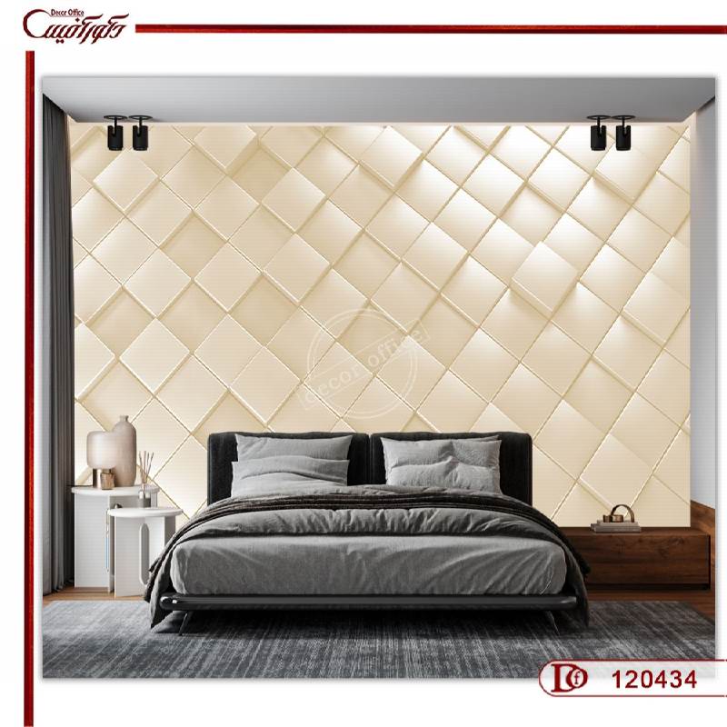 پوستر دیواری هندسی کرم رنگ یک طرح بسیار زیبا است که با هر چیدمانی هماهنگ می شود. در هنگام خرید کاغذ دیواری سه بعدی باید به رنگ و طرح آن بسیار دقت شود. بهتر است که طرحی انتخاب شود که با فضای مورد نظر هماهنگی بیشتری داشته باشد. در این طرح اشکل مربع شکل به صورت مورب با رنگ کرم طراحی شده اند. این نوع طرح به دلیل سادگی با فضای مدرن هماهنگی بیشتری دارد. به همین دلیل پوستر دیواری سه بعدی پیش رو را می توانید به منظور دیزاین فضاهای امروزی به کار ببرید. در این تصویر، کاغذ دیواری سه بعدی روی دیوار پشت تخت خواب نصب شده است. این بخش مکان مناسبی برای استفاده از پوشش های تزیینی و انواع دیوارپوش است. اما بهترین نوع پوشش به دلیل قیمت مقرون به صرفه و کیفیت بالای چاپ، همین پوستر دیواری سه بعدی می باشد.